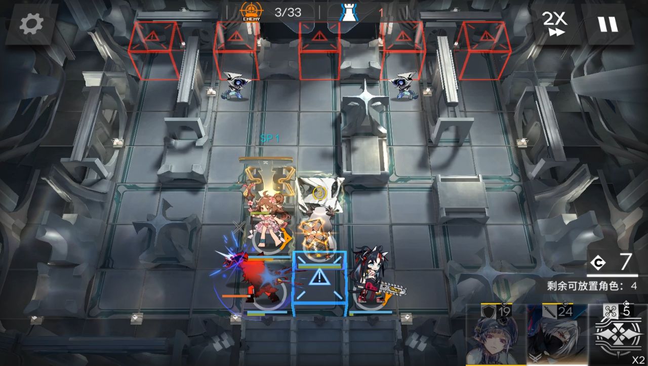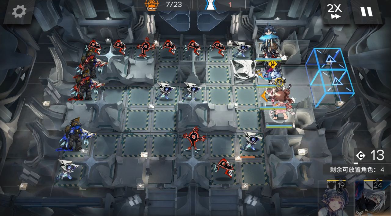 依次部署塞雷亚,小羊朝右,拉普朝上,煌朝右挂机即可,注意塞雷亚那边小心漏怪,小羊练度要高。