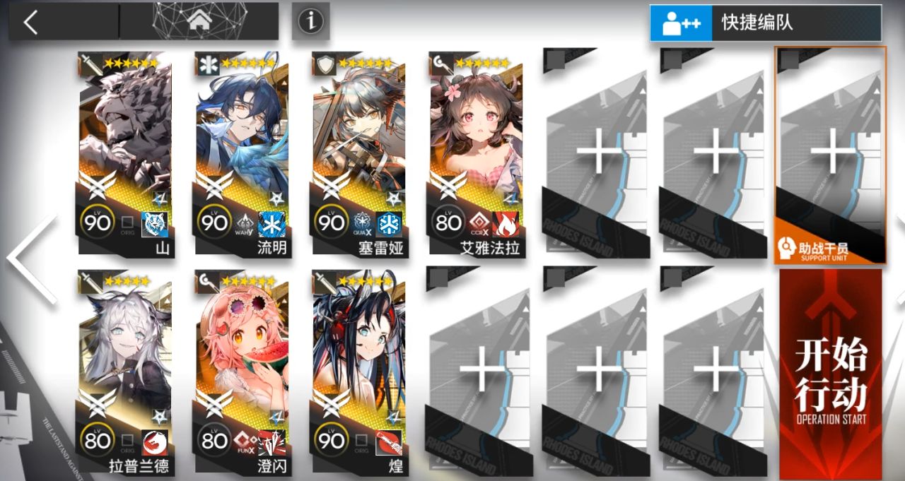 依次部署拉普朝左,山,煌朝右,粉毛,塞雷亚,小羊朝左,流明朝右挂机。