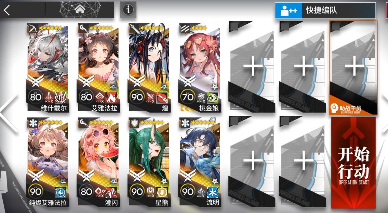 依次部署先锋,煌朝左,粉毛朝左,奶羊朝左,小羊朝右,流明朝下,星熊朝上(需要和煌2人血量在敌方一击线以上,对面A一下就会神经损伤眩晕,有流明在可以2人只有一个被眩晕卡住怪)W朝右开技能。之后挂机到W高台被秒杀挂了,在桃金娘左上角高台再部署朝上挂机到结束。