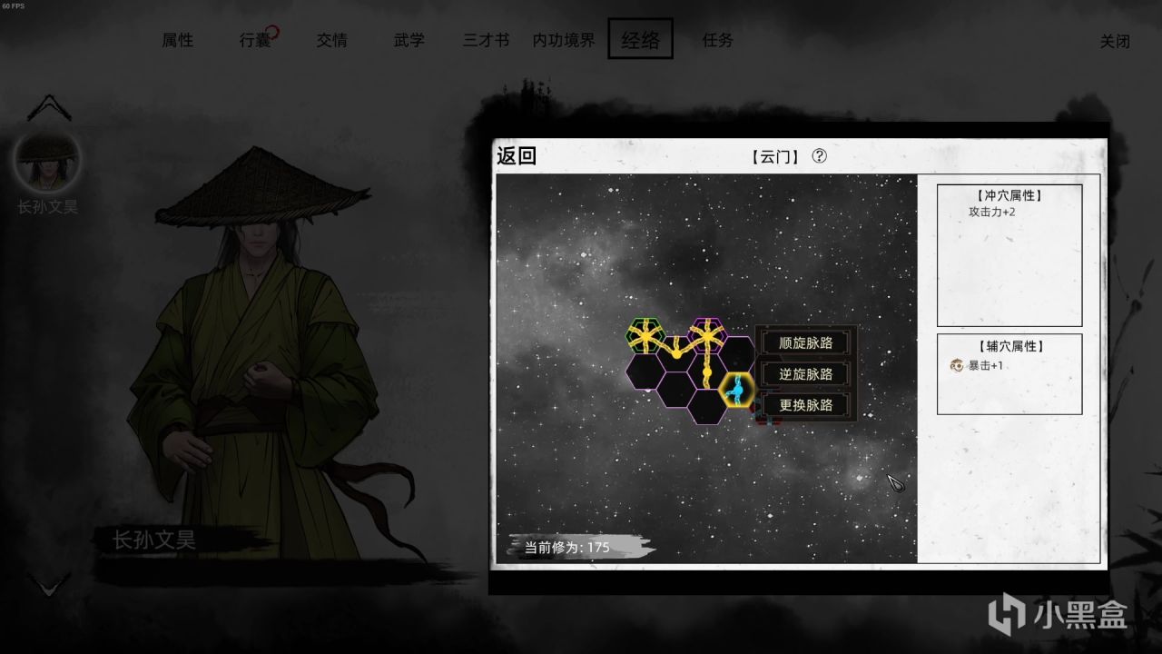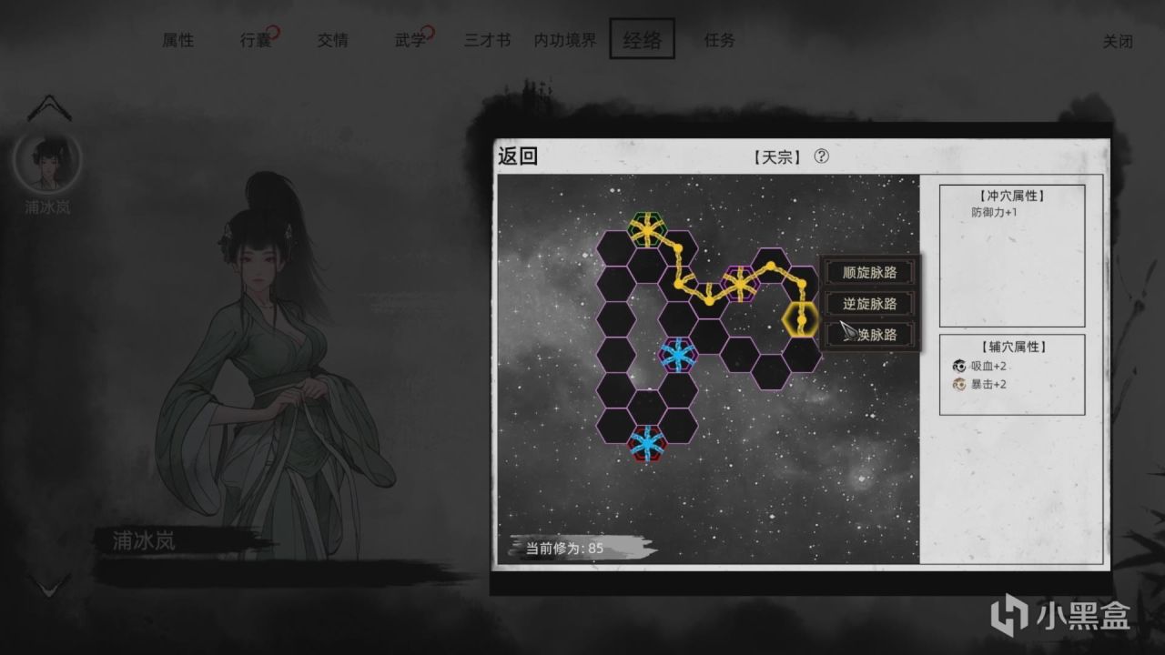 本作只是一個都沒正式進入EA階段的 Demo,但養成系統相當豐富,有了過關的餘力之後,長期玩日式RPG培養出來的收集癖又蠢蠢欲動了……比如經脈系統,原本只是一個很普通的“電路圖”玩法,加上“輔脈”之後我這個收集癖就不輔脈全通不舒服了……