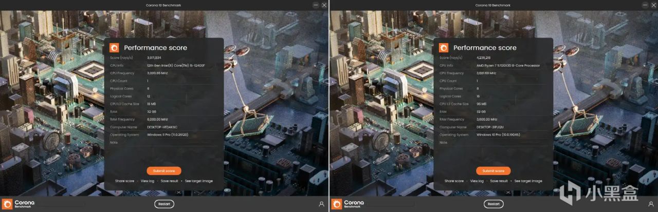 Corona Renderers 是一款全新的高性能照片級高真實感渲染器,可以用於 3DS Max 以及 Maxon Cinema 4D 等軟件中使用,有很高的代表性。這裏使用的是它專門爲性能評測推出的 Benchmark 基準測試軟件(已經更新到 Corona 10 渲染核心),測得i5-12400F得分爲3971834分,5700X3D爲4236218分。
