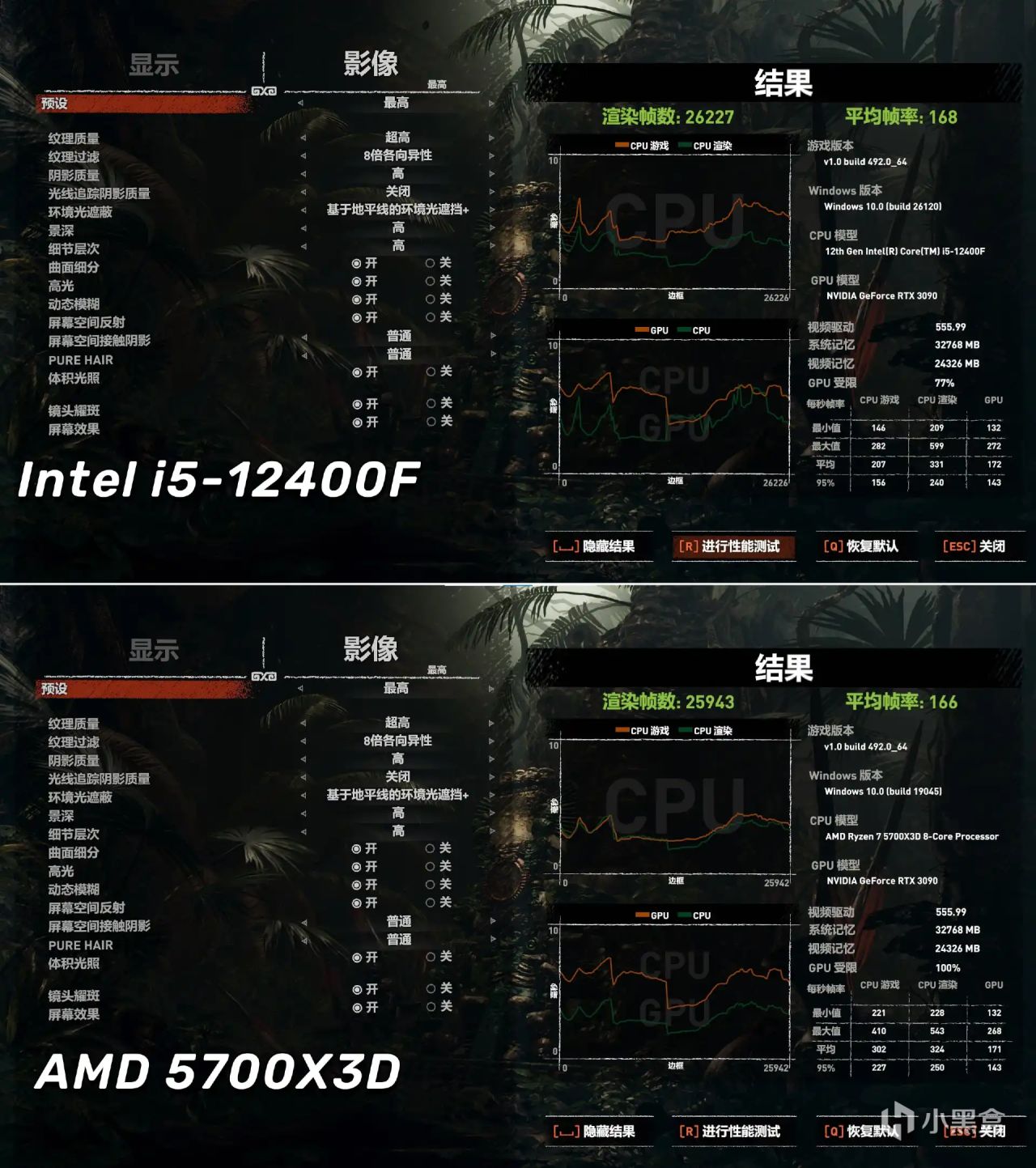 在《古墓麗影:暗影》中,測得i5-12400F平均爲168幀,5700X3D平均爲166幀,基本可以認爲是在同一水平: