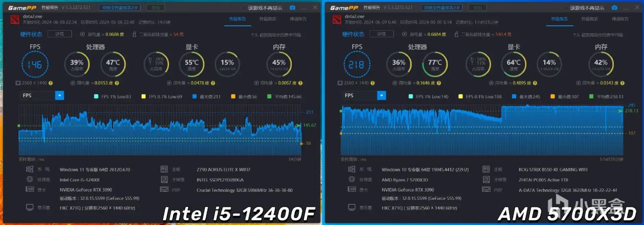 在《DOTA2》中,我們採用回放比賽錄像的方式,通過遊戲加加記錄回覆幀數,i5-12400F的平均爲146幀,5700X3D平均爲218幀,差距可以說比較明顯。