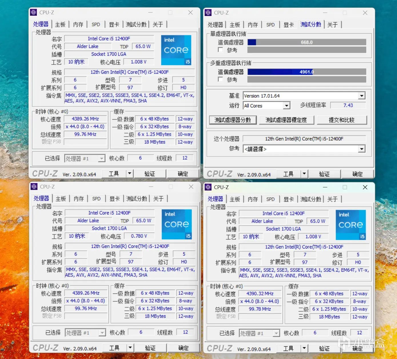 CPU-Z的測試跑分顯示,12400F單核得分668,多核得分4961。