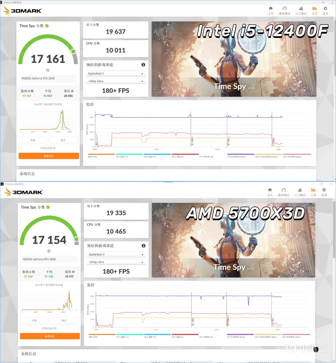 用3DMark 進行2K 分辨率下的 DirectX12 Time Spy 測試,i5-12400F的CPU得分爲10011,稍稍弱於5700X3D的10465 分。