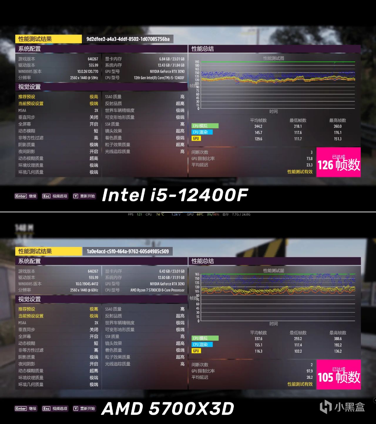 在《極限競速:地平線5》中,使用“極端”畫質檔位測試,測得i5-12400F模擬平均幀數爲126幀,5700X3D只有105幀: