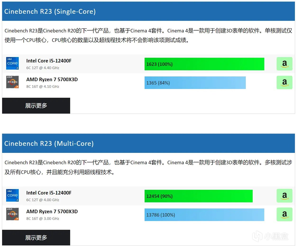 從CPU-Monkey給出的權威測試結果來看,在Cinebench R23測試中,i5-12400F由於加速頻率更高,所以在單核性能方面高出5700X3D了16%左右;而5700X3D由於核心和線程數更多,所以多核性能要強了10%左右。