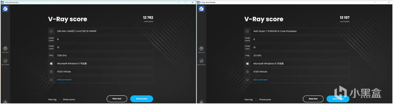 V-Ray 是由專業的渲染器開發公司 CHAOSGROUP 開發的渲染軟件,是業界最受歡迎的渲染引擎,其內核可應用在 3Dmax、Maya、Sketchup、Rhino 等多個軟件內。這裏咱們使用官方的Benchmark 基準測試,測得i5-12400F得分爲12792,5700X3D得分13107: