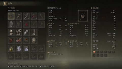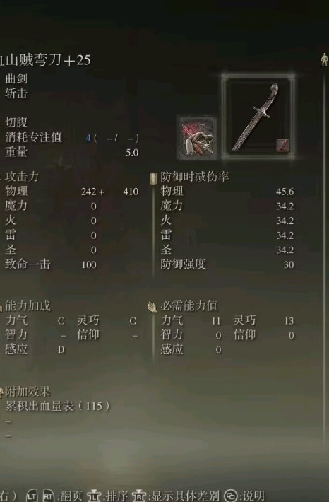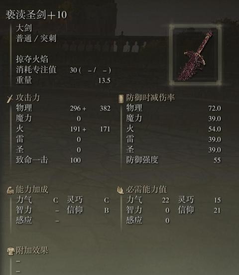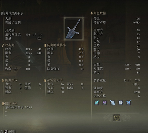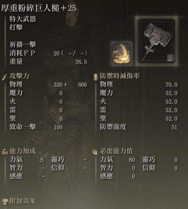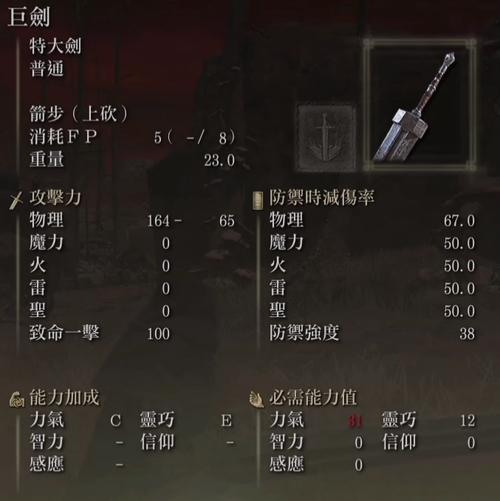武器面板不低,尤其是在質變厚重後,力量補正爲S!這裏再提一句:力量屬性有一定的特殊性,在雙持下力量數值可增強爲1.5倍!也就是說原本需要15點力氣才能拿的武器,雙持下只需要十點力氣即可,最重要的是對補正也有影響,66點力氣雙持後就等於99,也就是說如果雙持,66點力氣就夠了,剩下的點數可以加其他屬性。