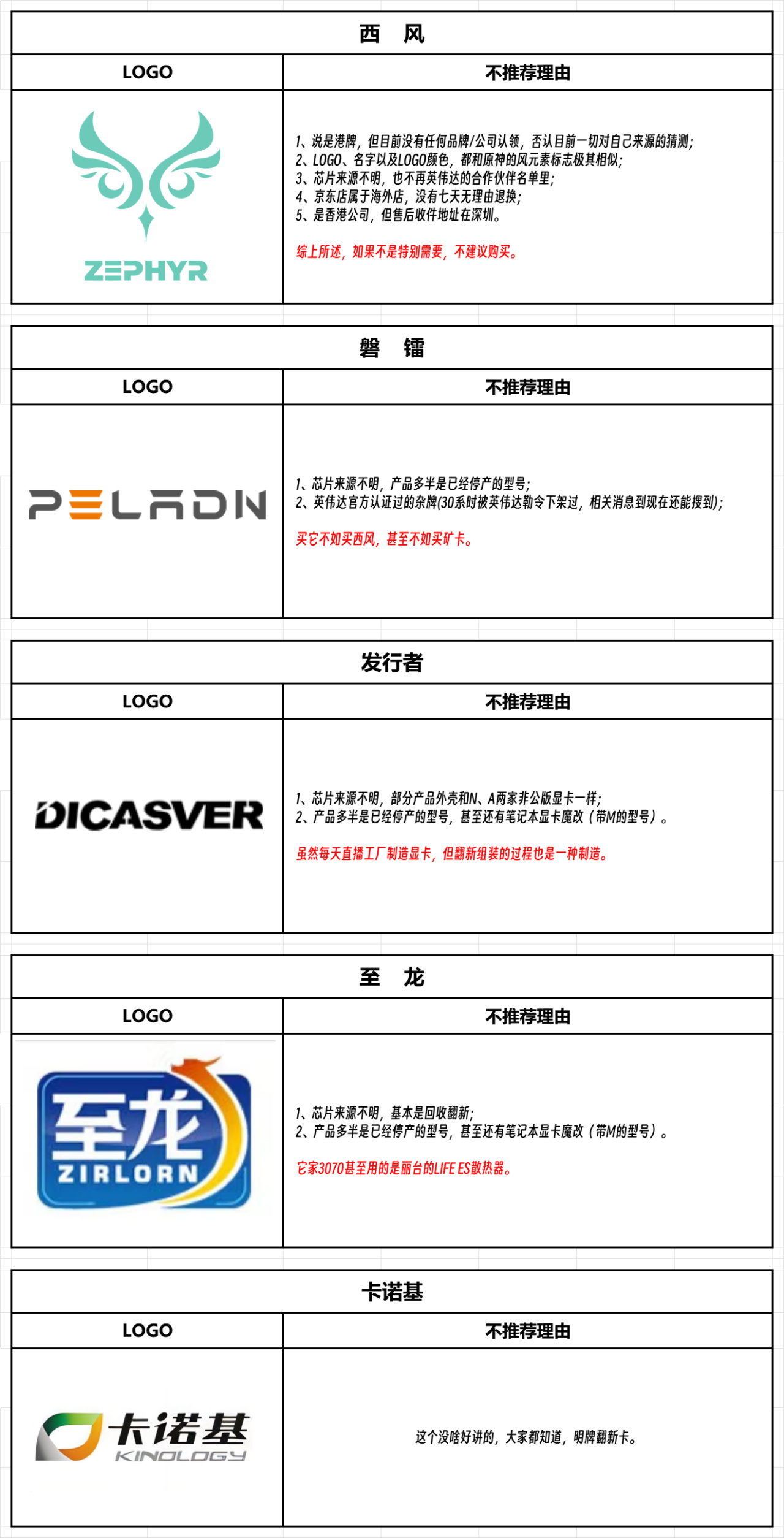 以上就是显卡品牌的简单介绍,个人建议大家,特别是小白,买显卡就认准三家芯片厂商的大陆地区合作清单的品牌,顶多加一个PNY,其他的不如买矿卡。