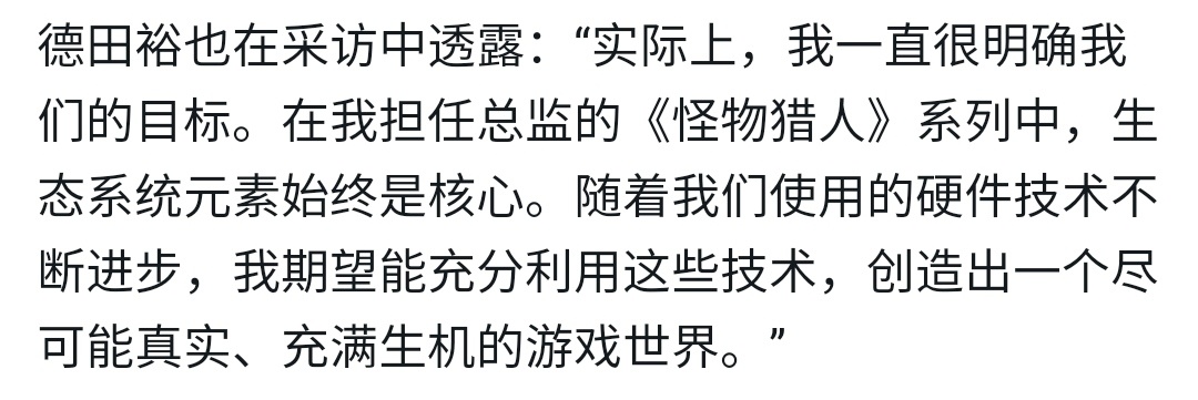 - 德田再次提到會充分利用硬件去展示生態,也就是說這一作可能不會有過去的“神優化”。關於卡普空的“神優化”,其實我不是十分認同,過去的“神”是建立在生化系列場景的取巧上。到了開闊場景還是會暴露一些問題的。不過怪獵系列作爲卡普空的命根子之一,想必是不會亂來的,但推薦配置應該不會太低(正好明年RTX 50要發佈了)
