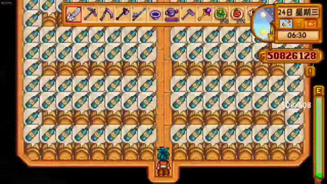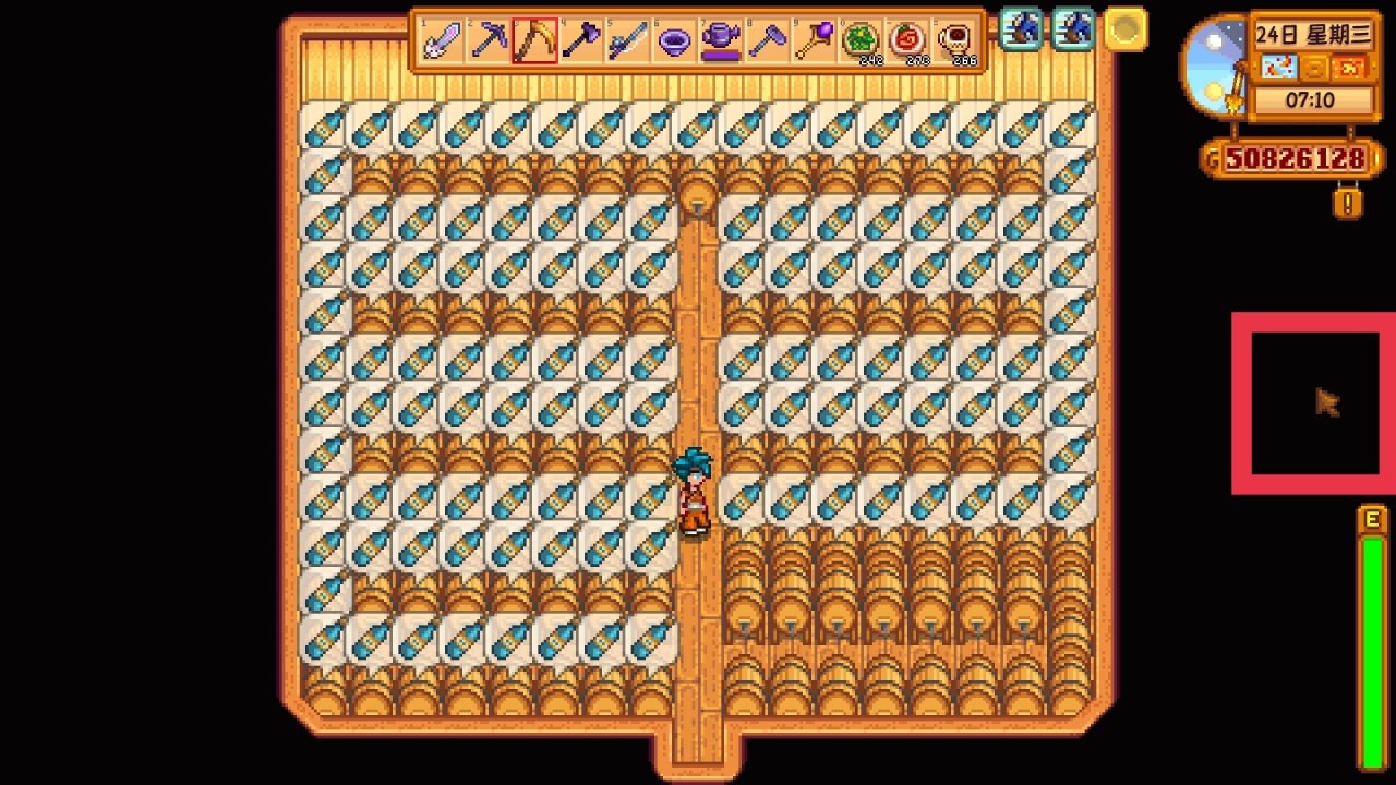 然后我们长按鼠标右键,这时鼠标就不用移动了,我们再移动人物到这些小桶位置就会自动收获了,这样既不用一个个点,也很快很方便(放入作物时也一样的操作,你也可以在人物移动的同时移动鼠标对准要收获的小桶,但这样的话鼠标就要随着人物的移动而跟着移动了,像我上面那样就只需长按鼠标右键,然后只管人物移动就行。左键是做不到的)