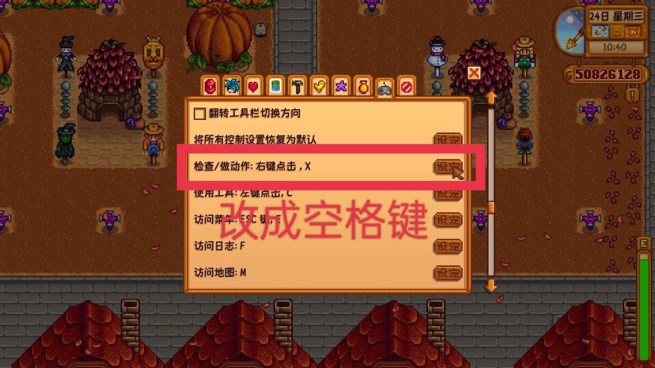 这个是双排种田时用的,空格键是我自己调的,原本是x键,我们首先打开选项,然后划到下面找到“检查/做动作:右键点击,X”,点击设定把它改成空格键就行(空格键方便很多,X键的话你的手会很别扭)