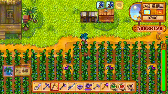 在我们收获作物的时候,只要长按鼠标右键就可以快速收获了,这样的效率比用鼠标左键一个个点快很多,这里还有个细节,就是我们人物的作物收获范围是三格,也就是中间一格,两边各一格(如我下图所示),我们站在三排作物的中间,长按鼠标右键➕向下移动,我们面前那一格的作物就会自动收获,这时我们长按的鼠标右键不要松开,在人物移动的同时把鼠标向周围两格的作物来回移动,就能实现三排作物一起收获的效果,它这个原理是这样的,在你收获作物时,会有一个把作物向上举的动作,如果你长按右键去收获并且鼠标快速向周围两格作物移动,它就会触发中间那格作物的收获动作同时,把周围的两格作物也收获了,也就是实现了一个动作收获三排作物的效果,这个需要时机把握的很好才会触发,所以我们也没必要去实现每一次收获都这样,大家就按照我上面说的方法去收获,那么就会时不时的触发几次,你们在这过程可能会感觉到一下很快一下又慢了,这个原因就是偶尔触发这个机制所导致的。说的可能有点复杂,但其实很简单,各位到游戏里亲自尝试一下就清楚了(长按鼠标左键的效果不是很好,我个人对比下来感觉,长按鼠标左键的判定比长按右键慢很多)