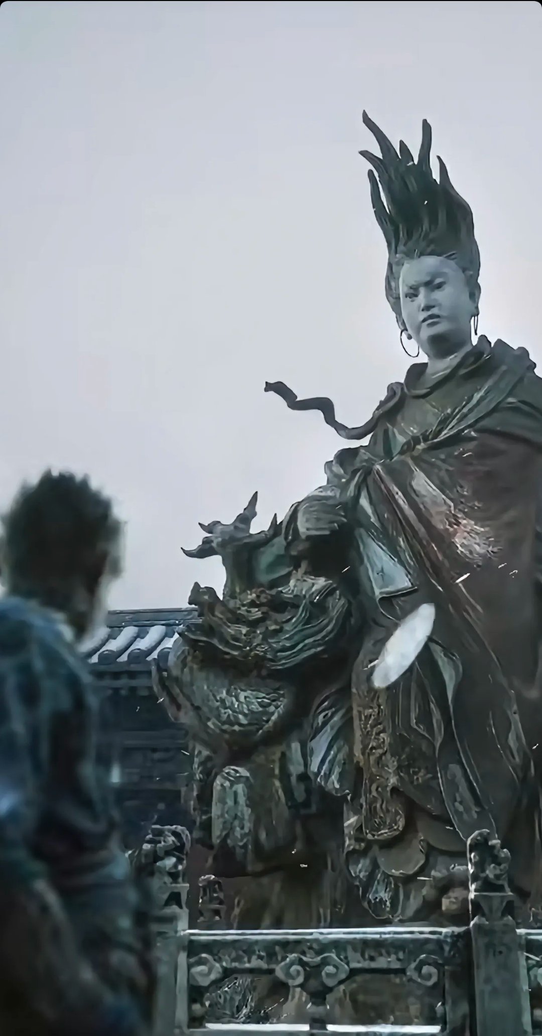 人物塑像的滿頭長髮向上豎立,形象地表現出“怒髮衝冠”的狀態。這個造型解讀爲,亢金龍馭龍於雲端,雲下狂風四起,直吹得頭髮飛舞。她的憤怒不是有放無收的張牙舞爪,而是一種以武制惡的雷霆手段,既表現出勢不可擋的勃勃力量,又蘊含着一擊必中的果敢與堅毅。