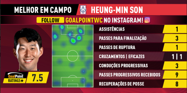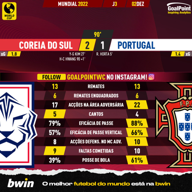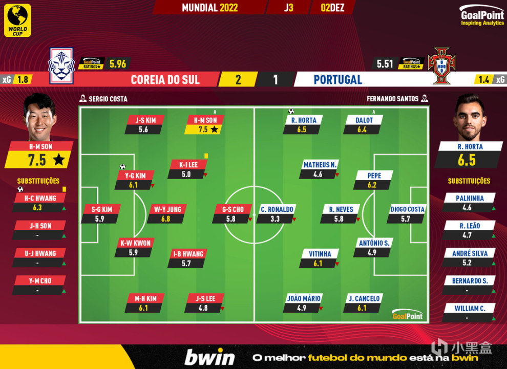 第78分钟,黄义助、孙准浩替补换下李刚仁和金英权,葡萄牙这边B席和威廉卡瓦略换下维蒂尼亚和若昂马里奥!第88分钟,韩国队打出漂亮配合,球来到孙兴慜脚下,孙哥自己带球被断!补时第90+1分钟,葡萄牙角球,韩国队打出反击,孙兴慜面对三人包夹从人缝中将球送出助攻,黄喜灿高速插上绝杀葡萄牙!两队头号球星表现都不算优,但韩国队坚持到了最后,孙兴慜相信队友完成绝杀!