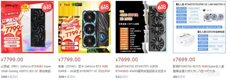 目前在电商平台上,4080 S的价格最低约在7600左右。本来我是想推荐4080的,但是直接停产了,这百分之几的性能提升看起来像是打发要饭的,遇到高频版的4080,丐一点的4080 S可能还真打不过。不过它毕竟是4080的Super版,后续应该会有驱动更新优化,以至于让它不会显得那么尴尬。