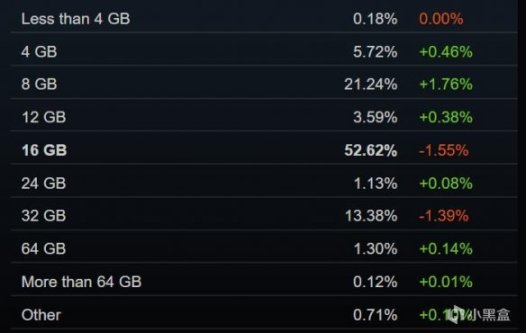 8GB内存的使用率占比提高1.76%,涨幅最大。不过使用最多的还是16GB内存,占比52.62%,比10月降低了1.55%。