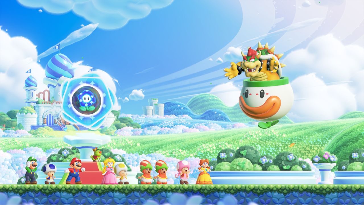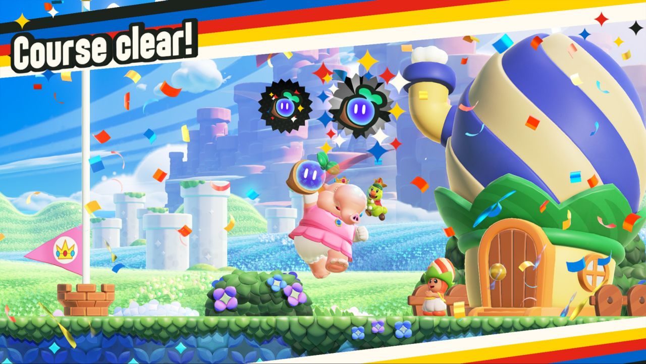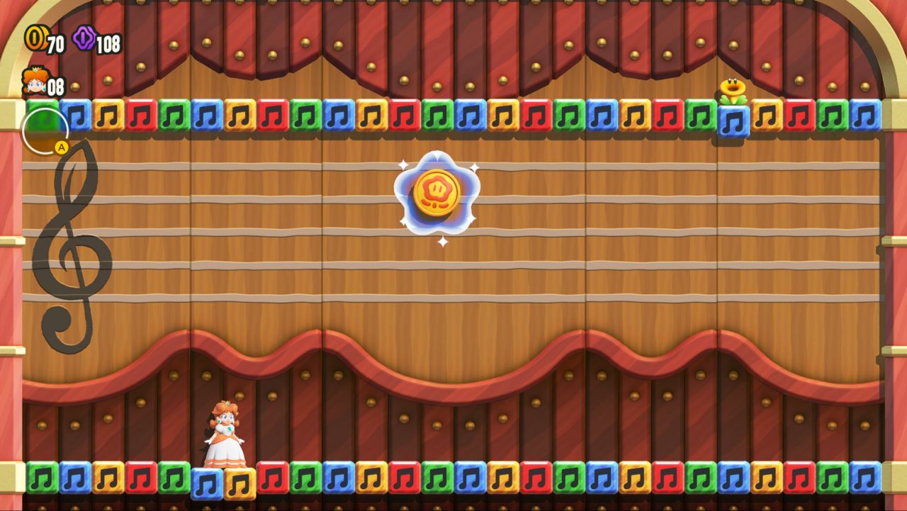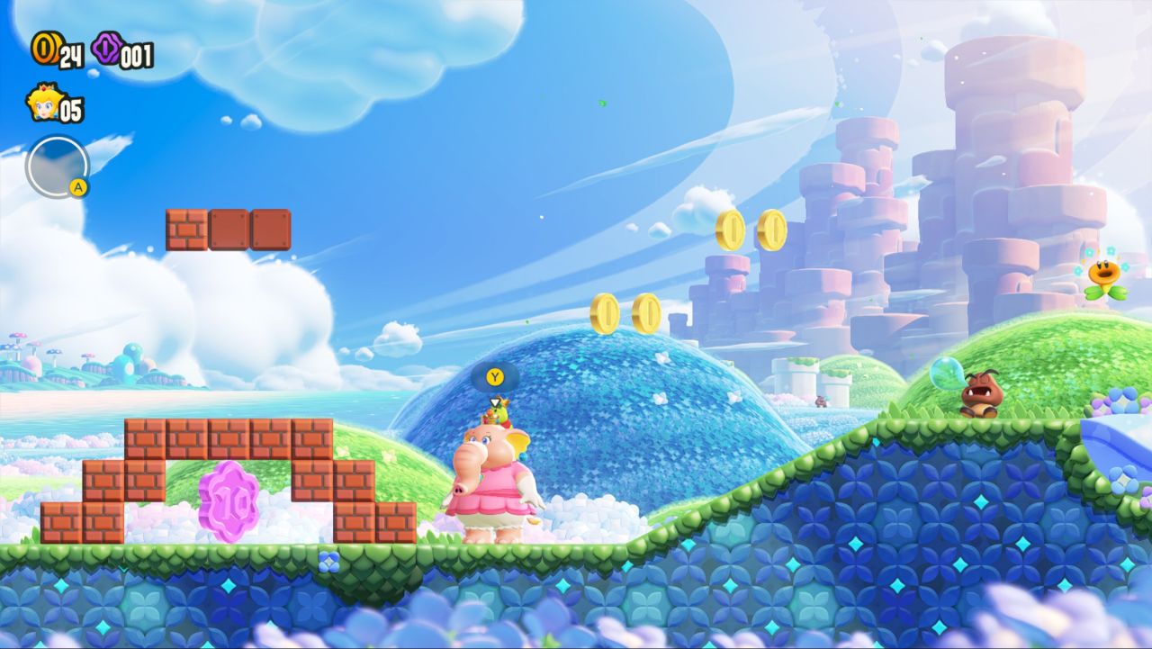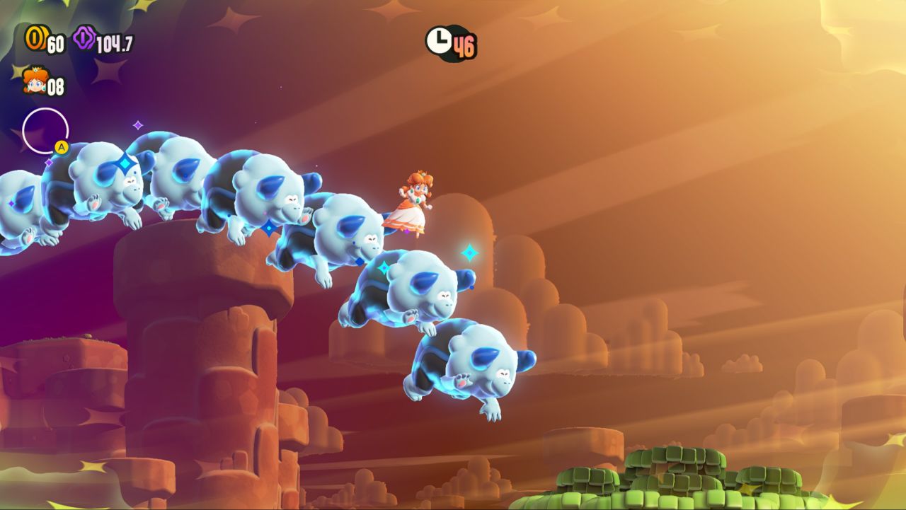 不過《馬里奧驚奇》還是給我了挺多不一樣的印象,首先是雖然回到2D,但是玩起來相當的輕鬆沒什麼壓力(至少初期是這樣的),初期比較困難的大概只有賽跑關卡,這個按住Y是衝刺,再按B是跳躍實在是有點睿智設計,加上我是主玩steam遊戲,平時用XBOX精英手柄,導致於看到提示還很容易按錯鍵——需要長時間的適應,但是馬里奧本身是一個適合碎片化時間的遊戲。