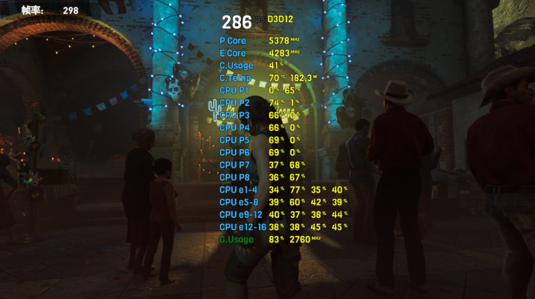 在实测中我们发现,即便酷睿i9 14900KS在游戏中并不会达到Intel Default Setting设置的253W功率上限,它在某些游戏中也出现了P核全核睿频还不到5.4GHz的情况,例如《古墓丽影:暗影》,这就让它最终的帧率表现明显低于全P核满血5.9GHz的成绩。当然,大多数时候Intel Default Setting下的酷睿i9 14900KS都达不到全P核睿频5.9GHz,一般在5.7GHz~5.8GHz之间跳变,实际游戏帧率与满血状态下相比大都要略低一点。
