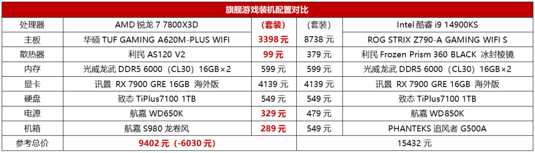 再回来看实战装机的情况。从两套旗舰级游戏主机配置对比来看,游戏性能更强的锐龙7 7800X3D不但在处理器以及板U平台的价格方面拥有绝对的优势,而且还因为对供电与散热的要求更低,有效降低了整机在散热与供电方面的预算,最终整机售价相对酷睿i9 14900KS整机有高达6030元的价格优势,在性价比方面堪称跨越维度的完胜。