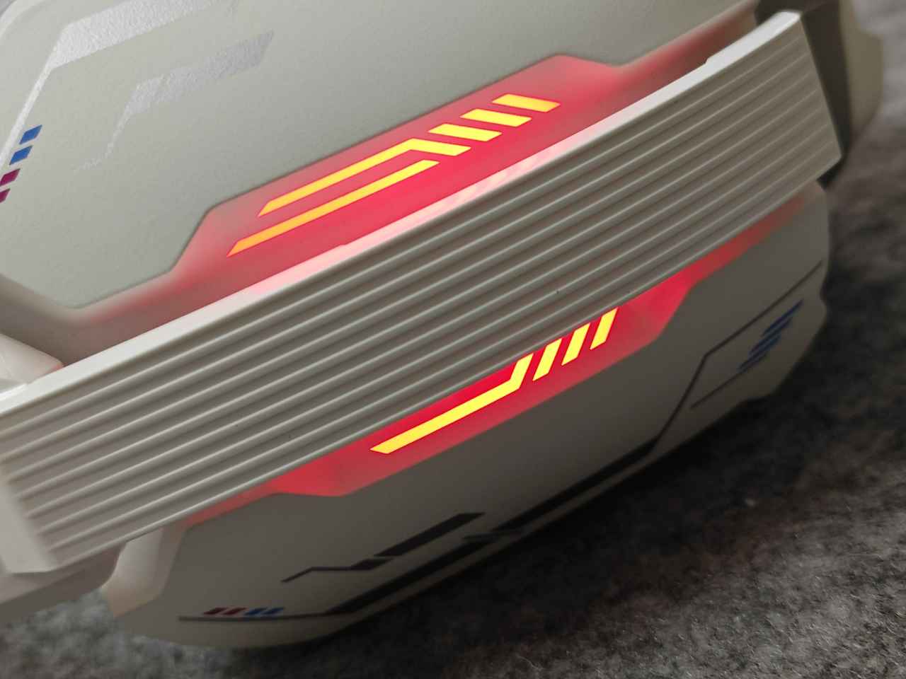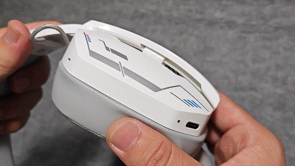 他在耳罩還有漸隱式的燈條,燈條有7色燈效可選,可一鍵開啓/關閉光效,燈效做得是非常炫酷,有種非常濃的機甲風格,開燈之後燈效與背殼的融合性很強,有一種渾然天成的感覺。