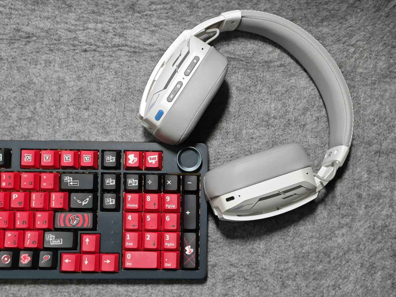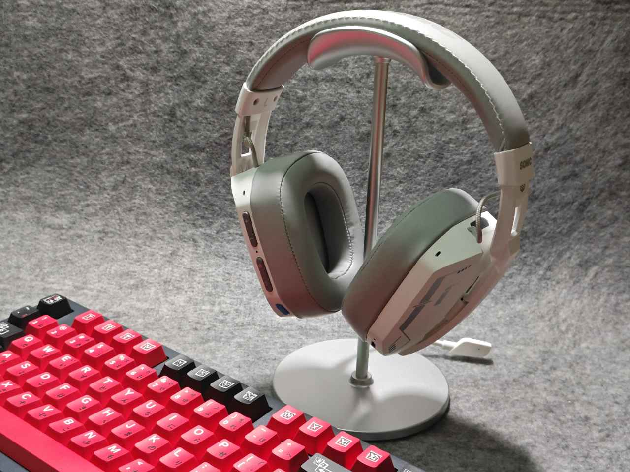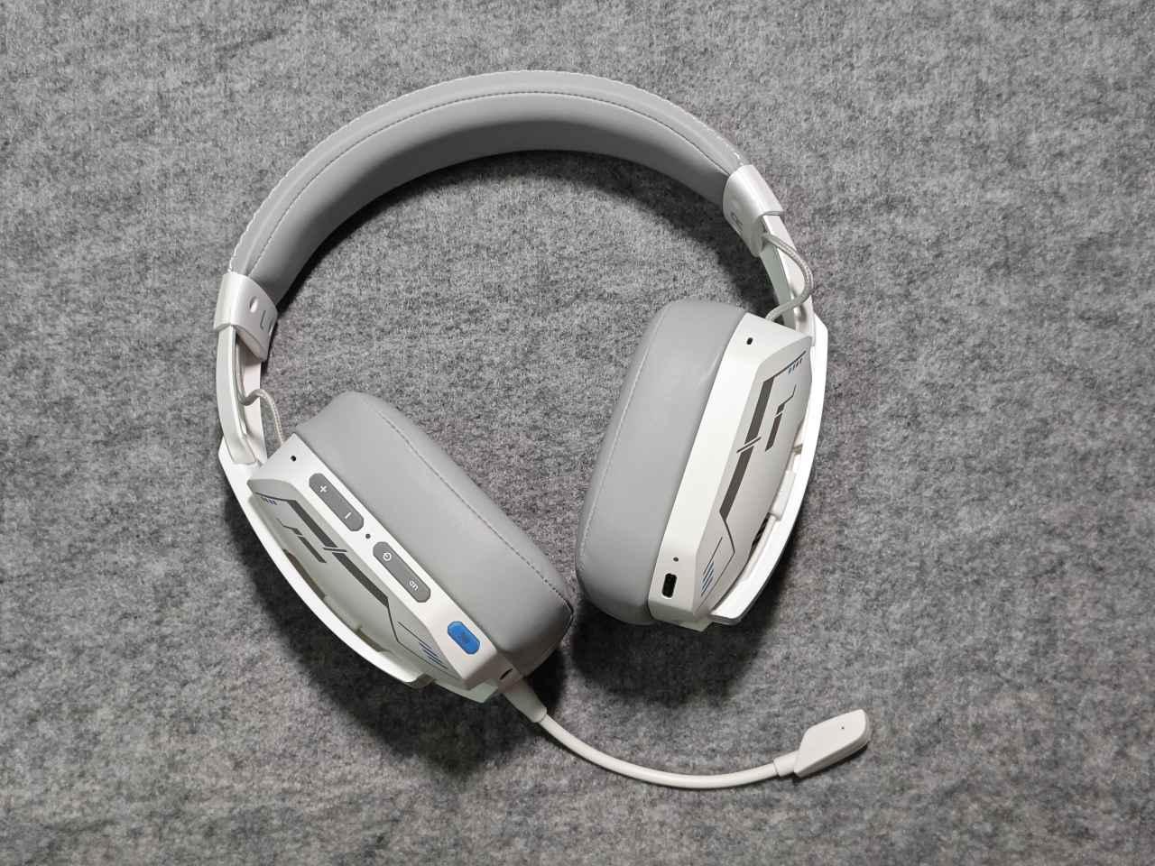 耳機在左側耳罩外殼有一排功能按鍵及指示燈,插孔什麼的。分別是:音量鍵、狀態指示燈、開機鍵、燈效鍵、開關麥克風、3.5mm音頻接口、隱藏式麥克風。右側是一個充電指示燈跟充電口。設計是偏簡單的,按鍵數量較少,但是可以通過組合鍵的形式實現各種功能。