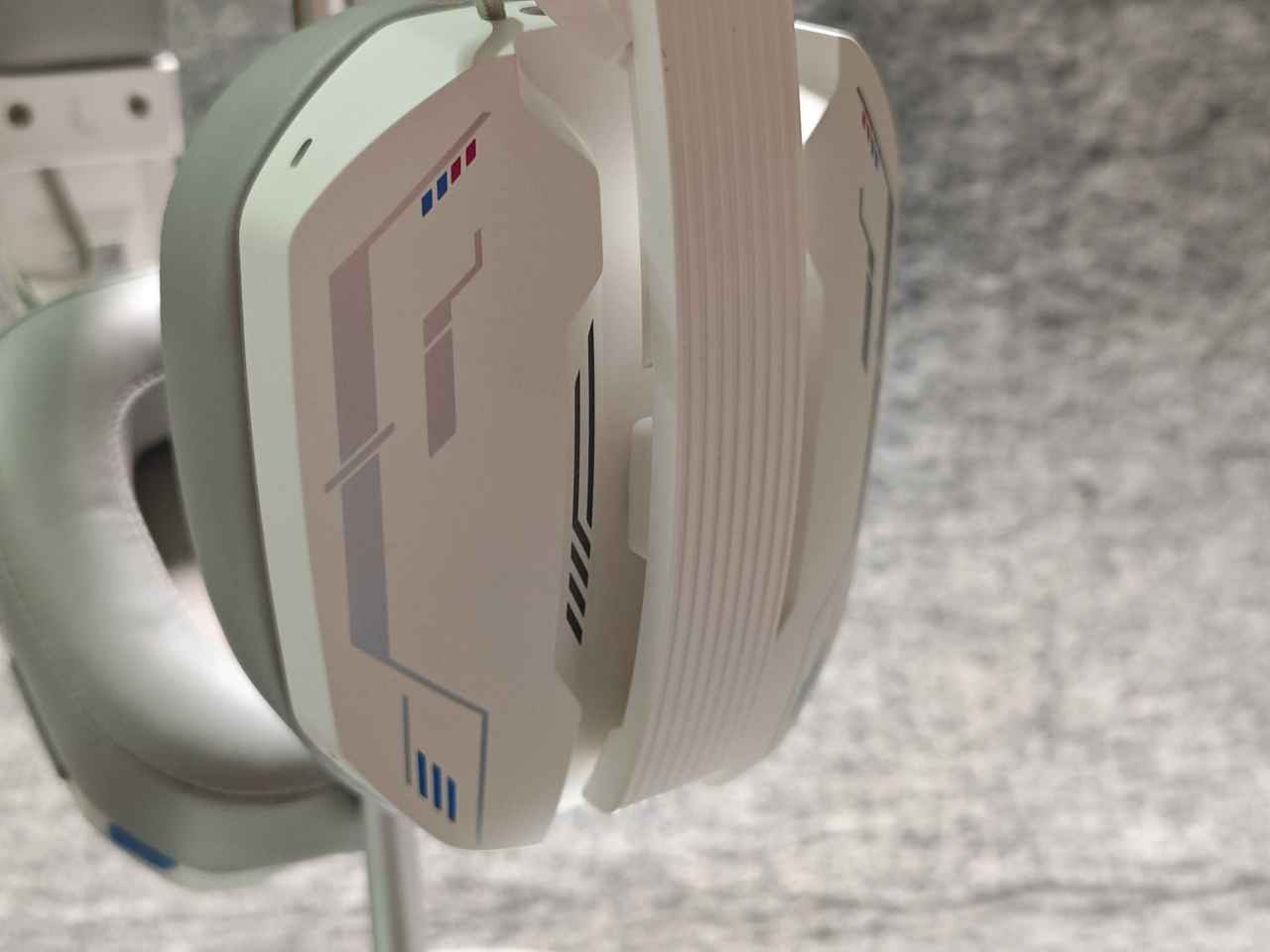 耳機一共有兩個配色,分別是羽紗白跟曜夜黑,兩種配色都是非常炫酷的,以白色版本爲例,他的耳罩殼採用PC材質,磨砂質感,上面還有非常炫酷的圖案,八邊形的外殼設計,看着非常有電競範。