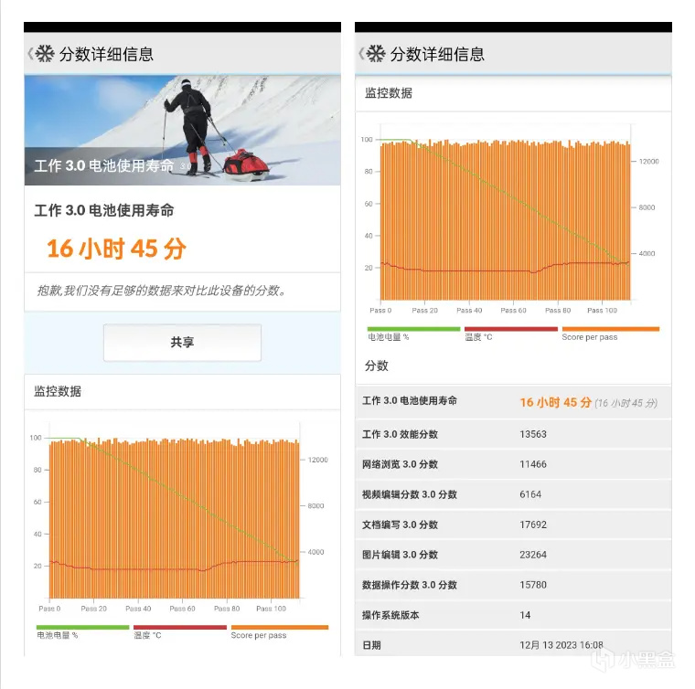▲续航方面,一加12配备了5400mAh的我通过PCmark 安卓版实测,一加12可以提供16小时45分的综合使用时长,持久度真的很OK,再配合上长寿版100W超级闪充,约26分钟即可为手机充满电,50W的无线闪充还支持反向充电,给耳机等小件充电十分方便。