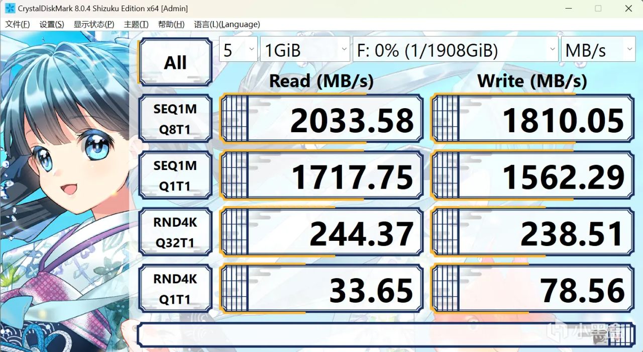 ▲佰维 PD2000 PSSD使用的USB 3.2 Gen2x2协议,这个接口基本上在一线、准一线主板品牌的中高端主板上都有配备,在此写一下,实测佰维 PD2000 PSSD的顺序读取速度为2034MB/s,顺序写入速度为1810MB/s,官标速度达成率非常之高,以这个速度传输2-3GB的视频,可以说是秒传,甚至来不及截图。