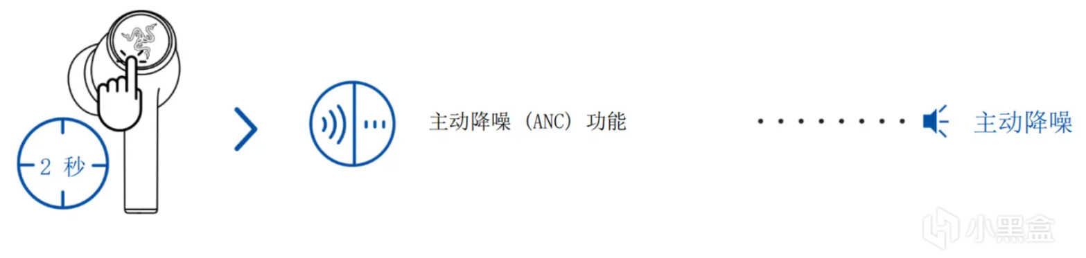 ▲另外,长按耳机上的雷蛇LOGO 2秒,也可以开关主动降噪(ANC)功能,这样在使用2.4GHz链接设备时也可以深度沉浸在游戏世界中啦。