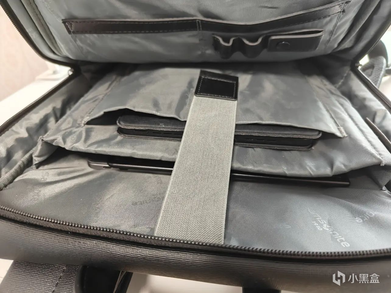 ▲背包内部空间布局也比较合理,放下笔记本+便携屏+平板后仍有较大空间,中短期出门携带各类物品也绰绰有余了。