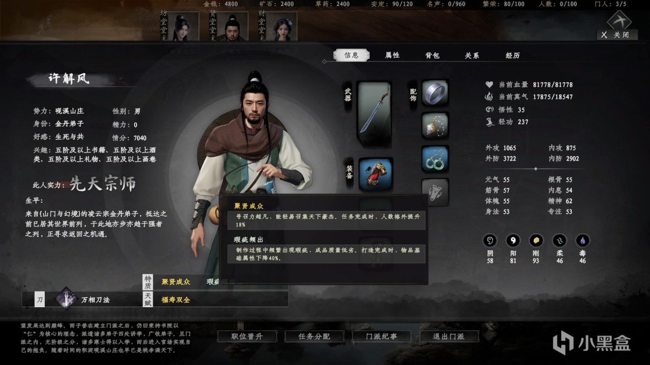 成爲掌門之後你就可以招募門人加入你的門派,在同其他NPC交互時選擇納入門下成爲弟子,注意原門派弟子可以百分百納入門派,但也需要你進行交互對話,門派建設經營的快捷鍵是F7,當然你也可以從菜單裏選擇門派開啓,可以查看弟子信息從而對弟子進行區域分配,比如許解風有着聚賢成衆的特質和福壽雙全天賦,可以任命爲賢堂堂主,同時你也可以在任務大廳選擇賢堂分配弟子進行招賢納士等任務,通過任務來提升資源,從而升級宗門設施,增加資源等獲取上限等等。