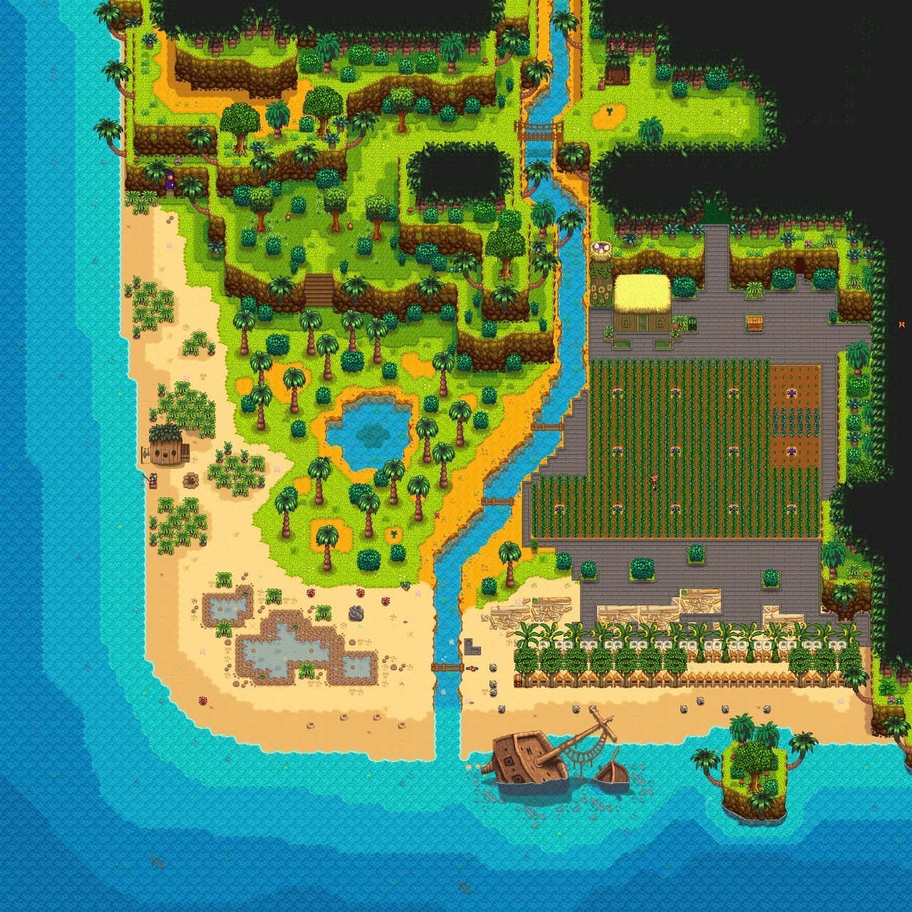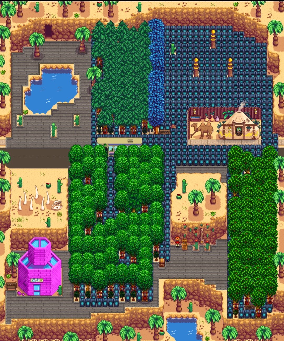 布局大概先像这样,一块6*6的地就能种30的啤酒花,这样的地建议种8块(更多也行,按自己的小桶数量来1.5天能酿一瓶淡啤酒,建议制作30*8*1.5=360个以上的小桶,200个以上也行)