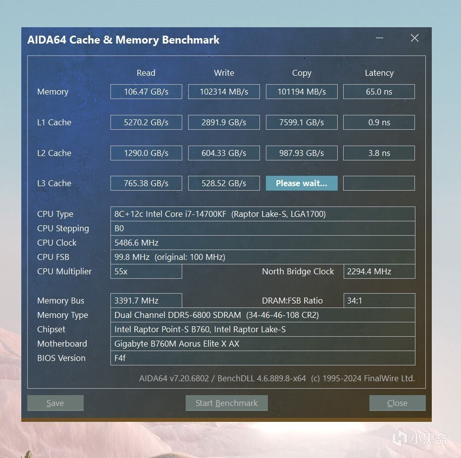 运行AIDA64内存测试,频率还是6800MHz,但是读写数据提升到了101GB/s-106GB/s,延迟减少到了65.0ns。