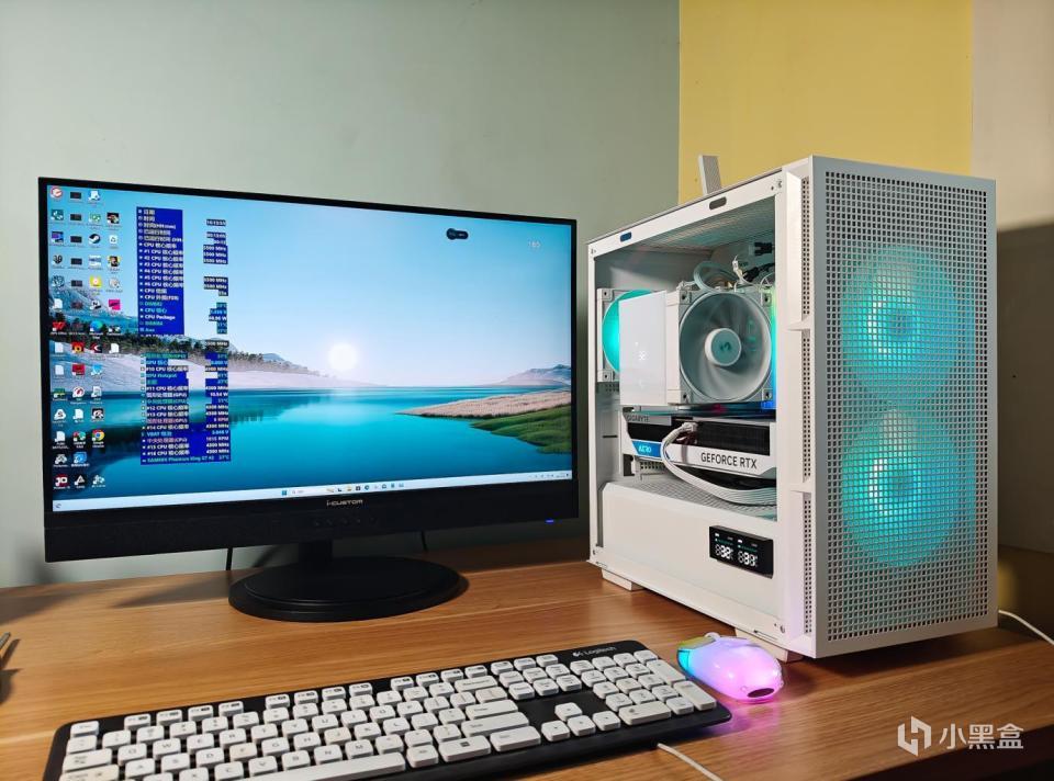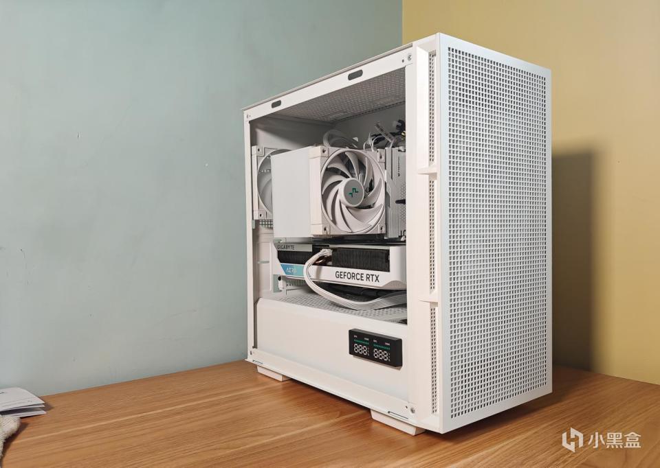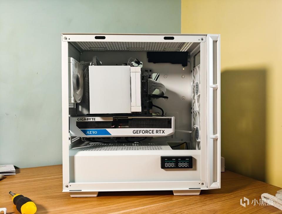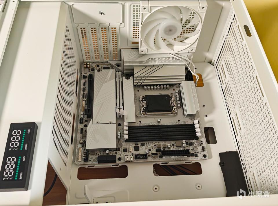 上图是安装完的效果,真正的风冷散热器哦,如假包换。两个前面的大风扇闪闪发亮,机箱满身网眼散热良好。白色主题清爽,机箱尺寸适中。