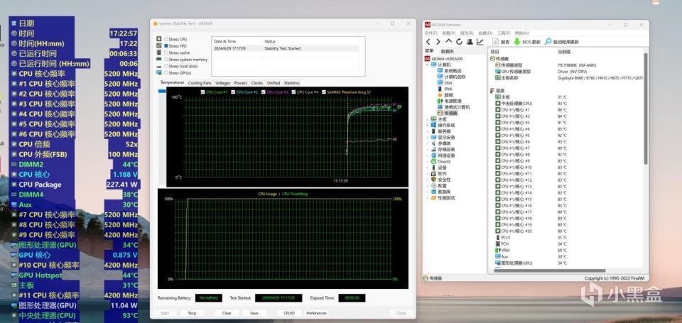 最后是我们关心的话题,风冷能压得住吗?运行AIDA64 FPU测试,结果显示可以温度稳定在了90度,功耗227W。表现还是不错的,这其中的原因,主要是最近技嘉的主板更新了最新的123微码,可以在不影响系统表现的情况下降低CPU电压,从而减少发热。