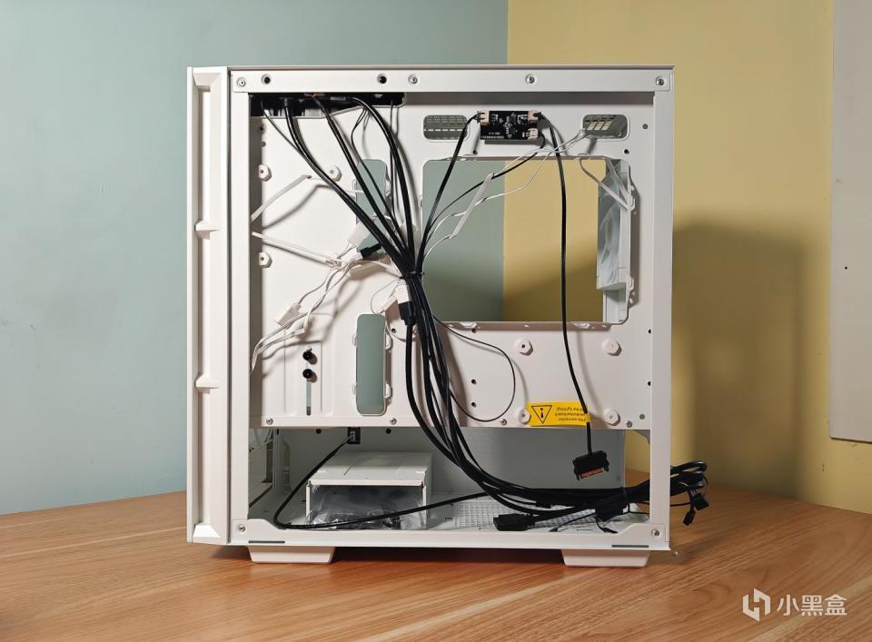 拿掉侧透面板,电源仓横贯机箱,上面有网孔,支持安装2个120mm风扇。机箱出厂前面带有2个140mm风扇,后面一个120mm风扇,均支持ARGB彩光。前面最大可以支持360水冷,机箱背板处可看到有显卡支架。
