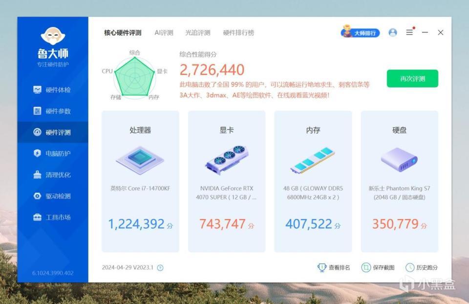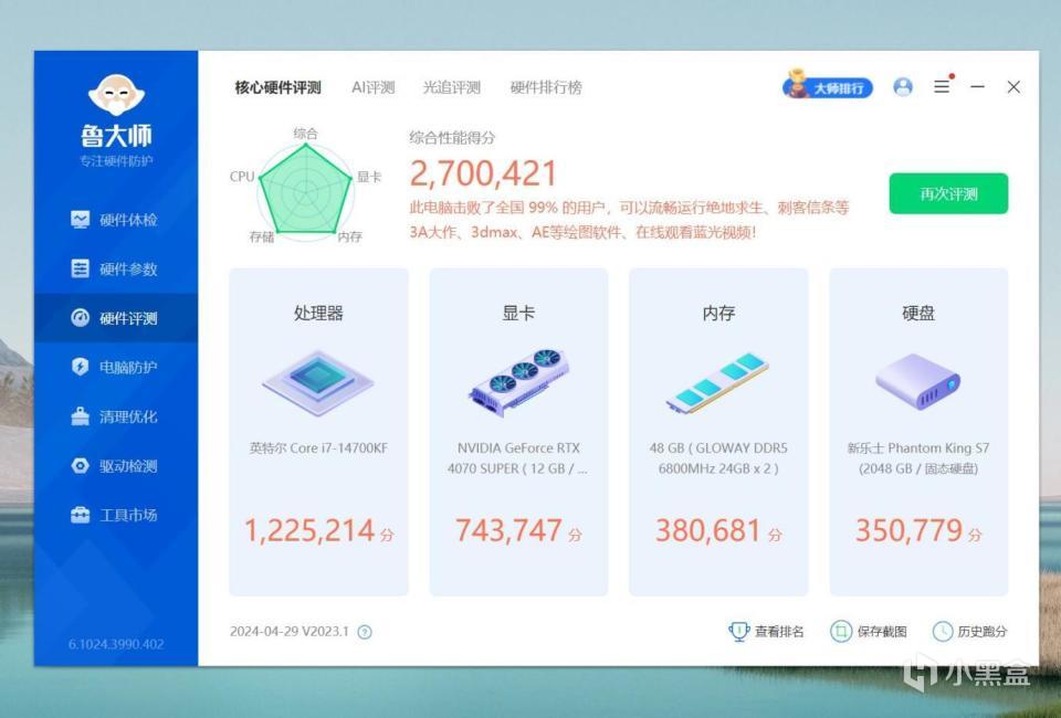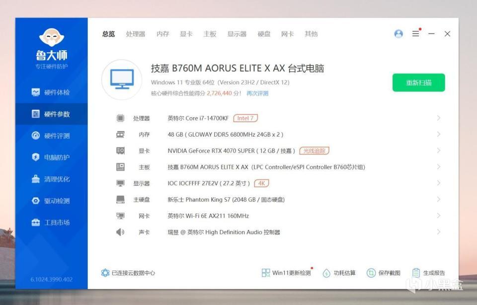先运行个鲁大师,看看这套电脑的配置。CPU是英特尔i7-14700KF,内存是光威DDR5 6800MHz, 24GBx2,显卡是技嘉的RTX 4070 super,主板是技嘉的B760M AORUS ELITE X AX,显示器是4K 160Hz显示器元创师E27。