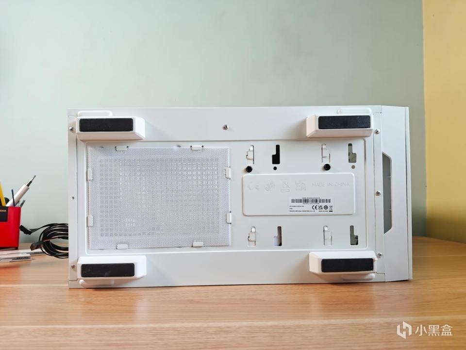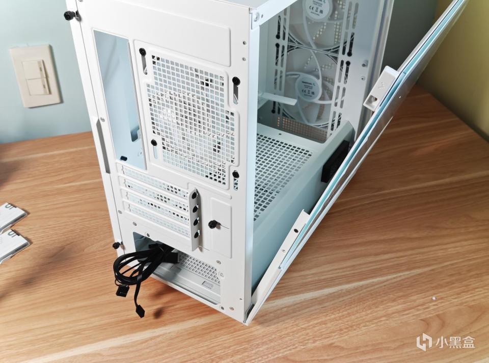 机箱的背面是传统的结构,下面是电源,然后是4个PCIE插槽位置,上方有个后置风扇。右侧则是钢板,免工具拆卸设计。
