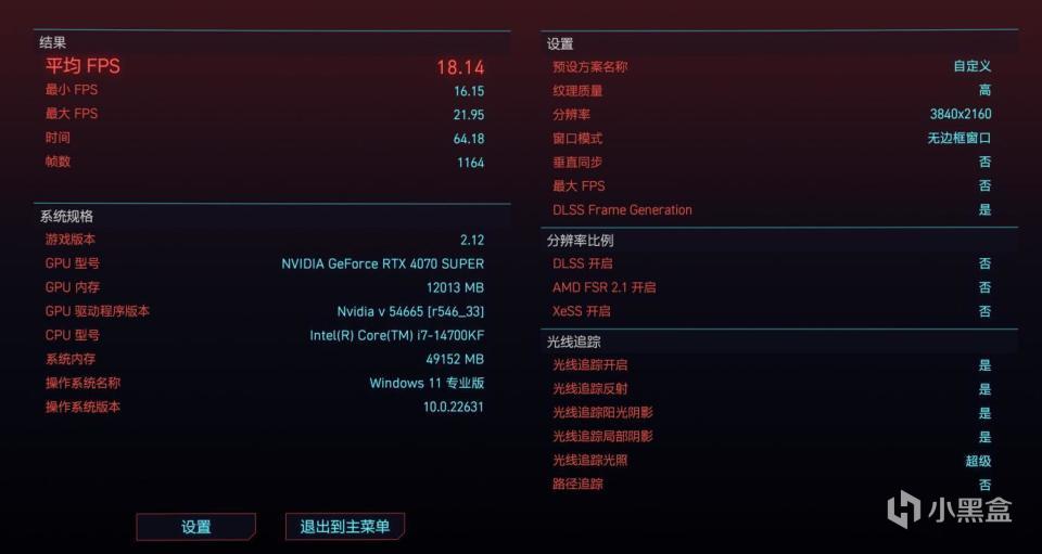 运行游戏试试,首先是赛博朋克2077,先关闭DLSS的情况下,高画质,4K分辨率平均帧数18.14。
