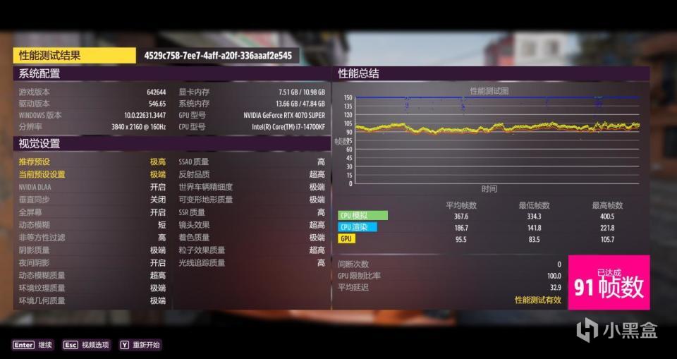 另外一款游戏地平线5,没有开启DLSS的时候,极高画质下的跑分结果显示达成91帧数。