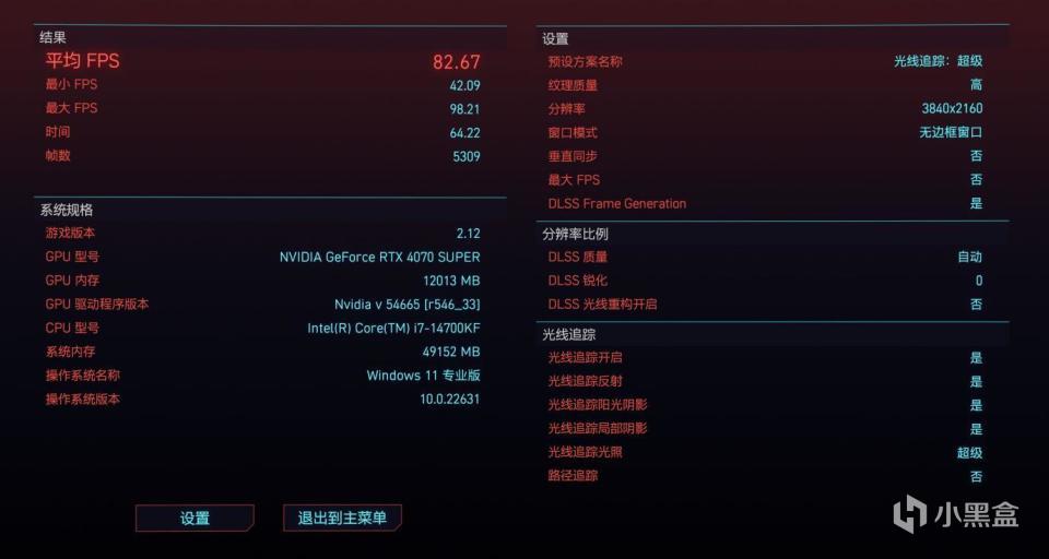 开启DLSS功能,画质质量是高,预设方案名称,光线追踪超级。结果平均FPS是82.67,提升巨大。也说明这款电脑可以畅玩3A大作,还是在4K高分辨率下。