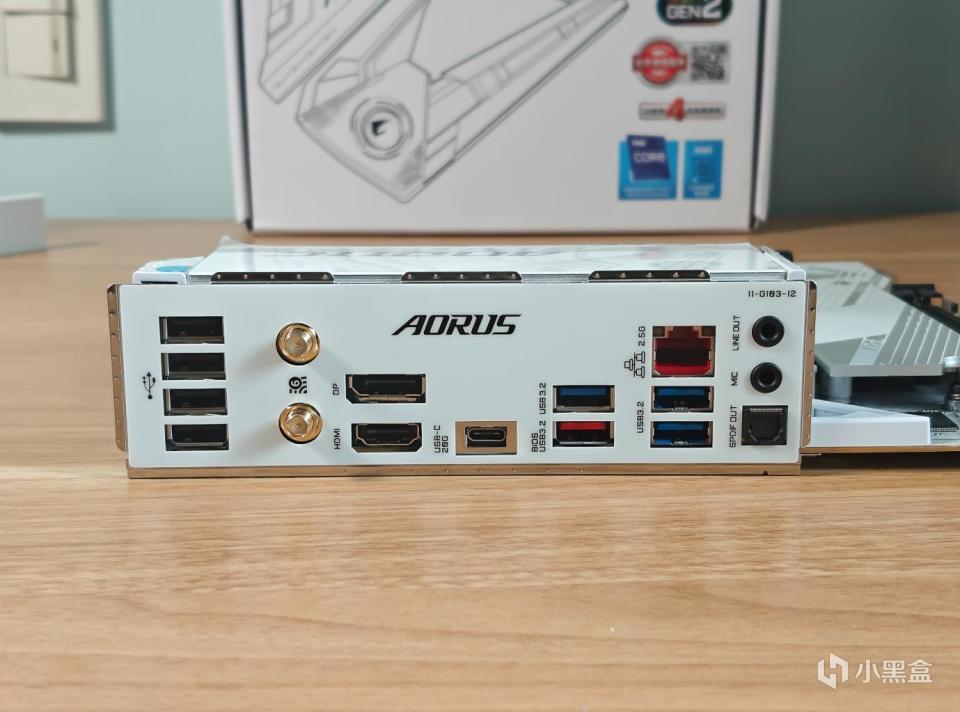 一体式IO接口后面的接口,从左到右包括有4个USB 2.0,无线网卡接口,板载DP接口和HDMI接口,一个USB 3.2 Gen 2x2 TYPE-C接口,3个USB 3.2 Gen 1,1个USB 3.2 Gen 2,2.5G有线网口,最右侧是音响接口。
