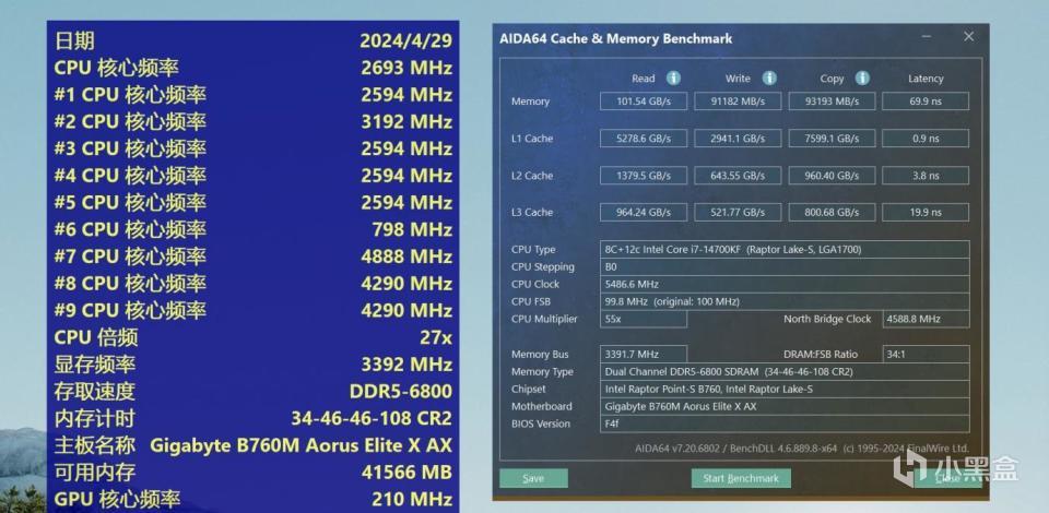 运行AIDA64内存测试,内存读写在91GB/s-101GB/s之间,延迟69.9ns。