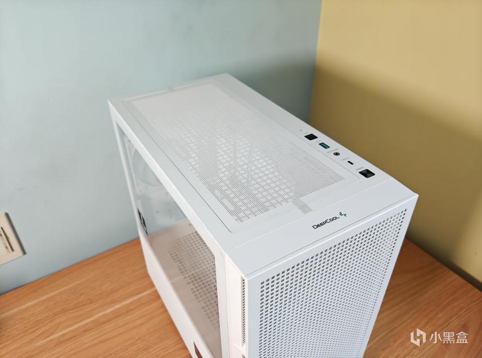 机箱的顶部同样是非常通透,顶部是磁吸的滤网,下面是很大的网孔。顶部支持120/140/240水冷,或者是最大2x140mm风扇。顶部右侧是面板接口,有电源按钮、TYPE-C接口、USB-A接口、音响接口,还有一个LED控制按钮。