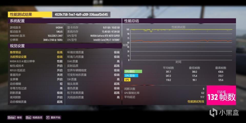 而开启DLSS后,达成分数提升到了132帧数,提升明显。