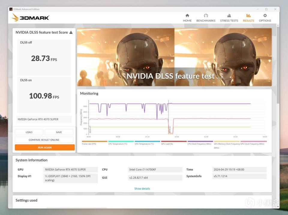 显卡支持DLSS 3,DLSS测试,DLSS关闭28.73,开启后可达到100.98帧,提升巨大。