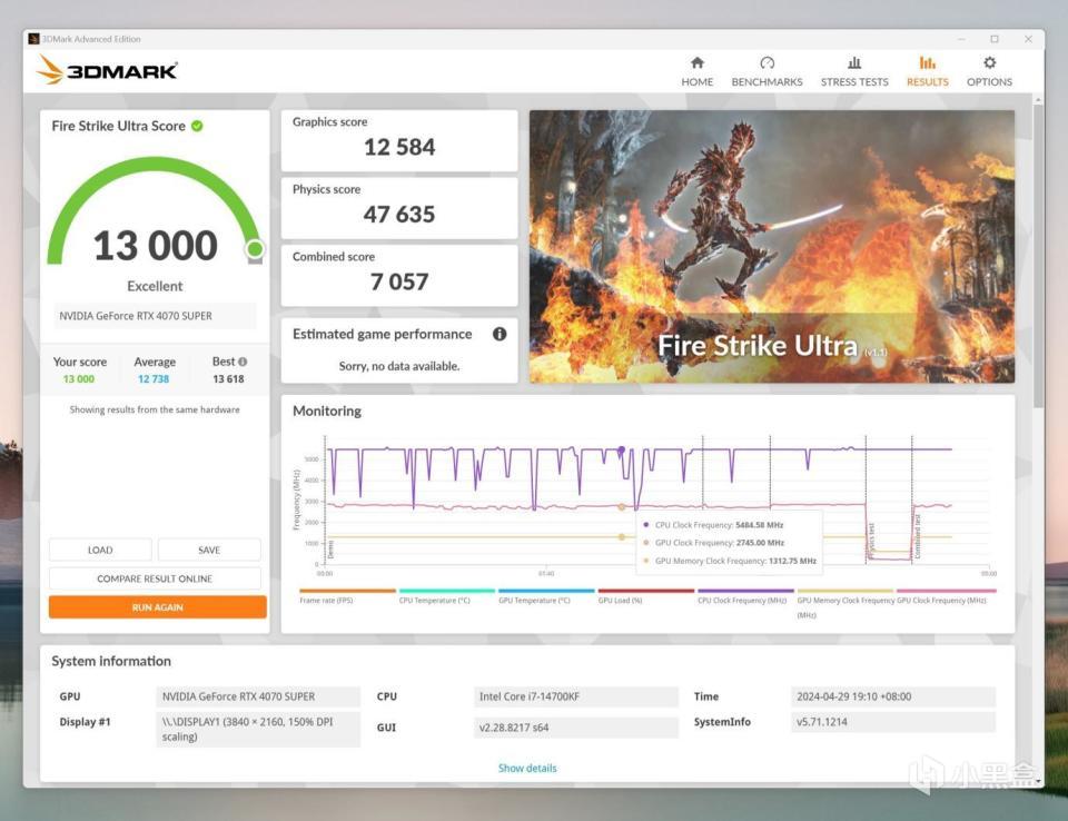 3DMARK FIRE STRIKE ULTRA测试,总分13000,其中图形得分12854,物理得分47635,综合得分7057。