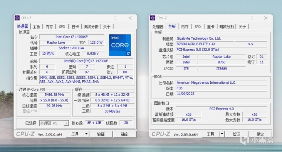 运行CPU-Z,CPU正确识别i7-14700KF,主板是技嘉B760M AORUS ELITE X AX。